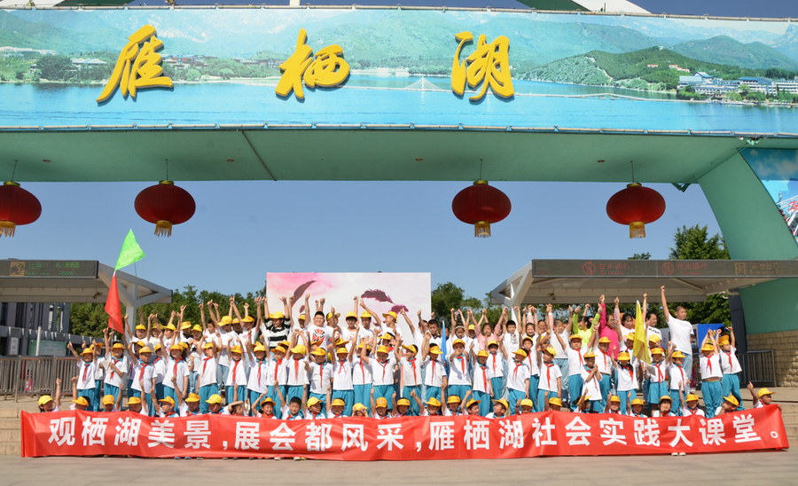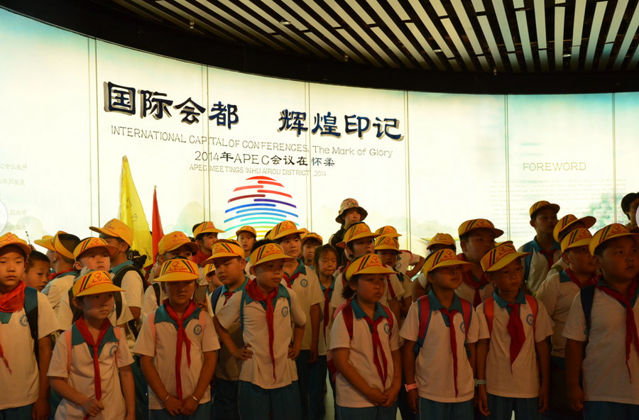 APEC展示墻上,內(nèi)容以介紹歷屆峰會、建筑風(fēng)格理念為主,讓學(xué)生們了解APEC及中國文化。墻的正前方便是雁棲島,國際會議中心、雁棲塔、12棟別墅、雁棲酒店都可俯瞰,可把知識與實(shí)際建筑相融合。在金燈山望湖亭上可以遠(yuǎn)眺長城、俯瞰會址,欣賞雁棲湖獨(dú)特的自然風(fēng)景。