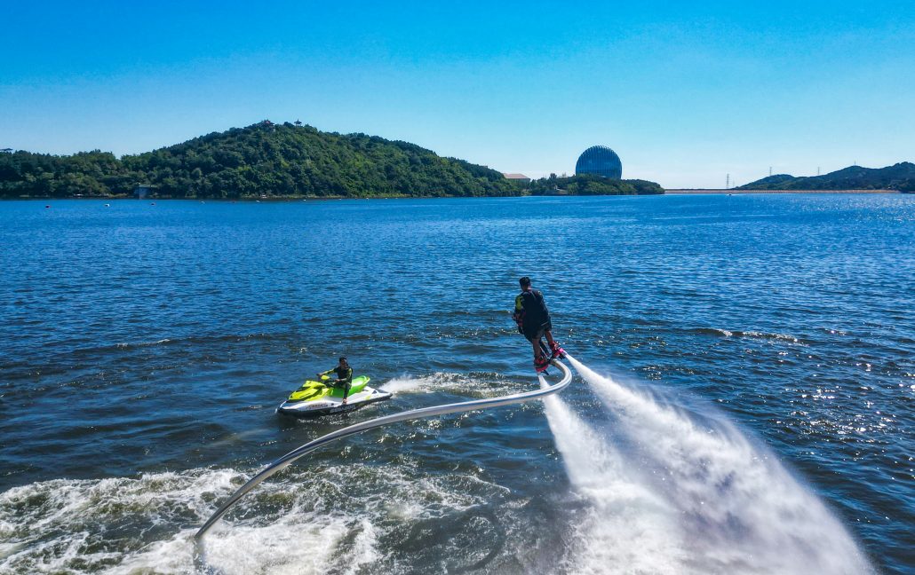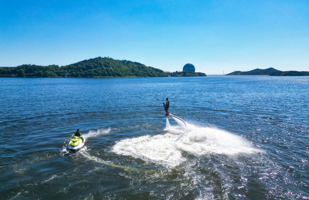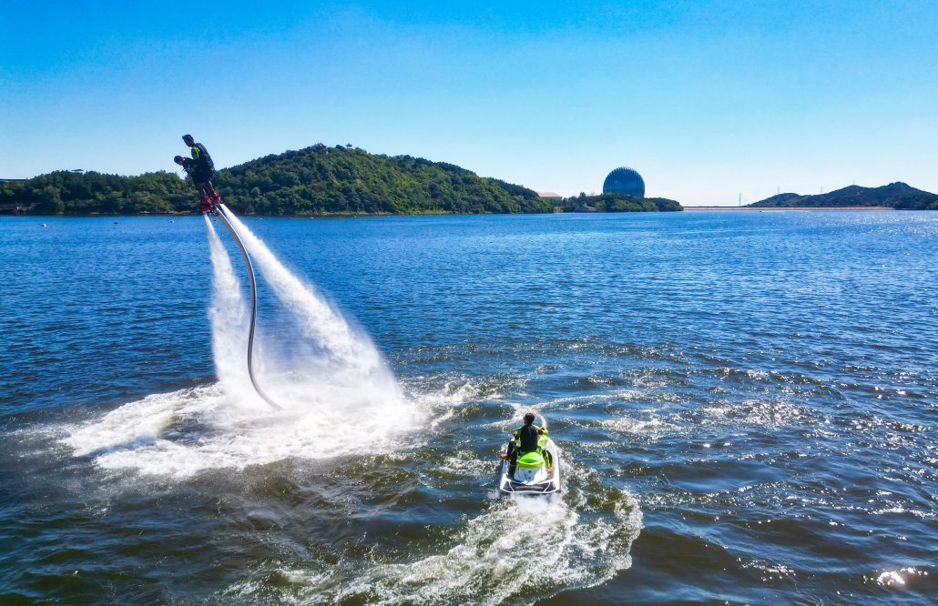 水上飛人:水上飛人是依靠附在摩托艇噴水口上的一條巨大水管抽吸雁棲湖水,再通過水上飛行器將水噴出,產生反沖動力,水上飛行器的動力控制,由摩托艇上的控制人員實現(xiàn),激起層層浪花,很是刺激。