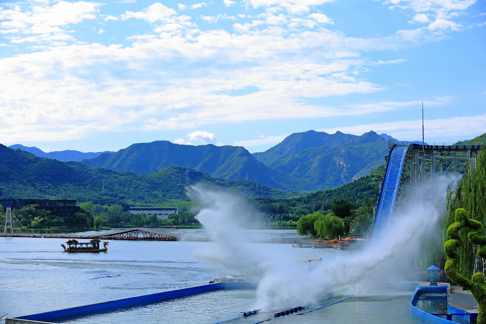 激流勇進:高達55km/h速度下,突然沖入水中,頓時眼前大浪沖天、水花四濺、游客瞬間被帶入漫天水霧。船體經水道快速漂流轉過180度水彎至第二級輸送部件,經第二級輸送機構,將船體輸送至二級提升段,再由二級提升段經鏈傳動將船體沿斜坡被提升至15米高的軌道上,轉過45度轉彎道后,船體即隨二級下滑軌道飛馳而下,在高達55km/h速度下,突然沖入水中,讓游客再次體驗沖浪的刺激感覺,讓游客感覺即驚險又刺激。