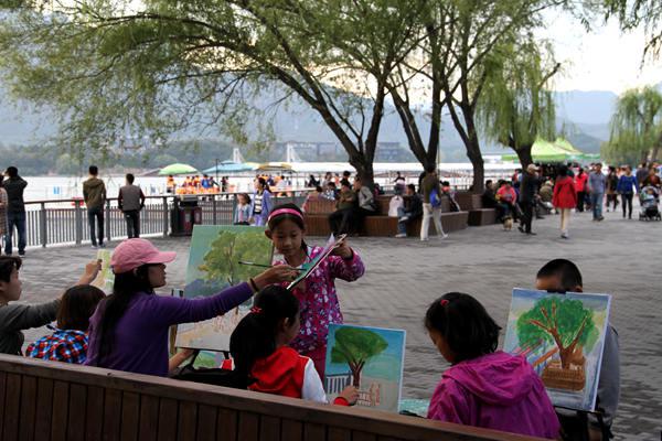 選好角度、支好畫板、調(diào)色做畫,小小畫家在雁棲湖湖畔留下了濃重的一筆。10月2日,來自北京的小小繪畫愛好者在湖畔進行現(xiàn)場繪畫創(chuàng)作,吸引了游客紛紛駐足觀賞。