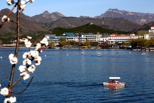 漫步雁棲湖內(nèi),藍(lán)天碧水間APEC會址精美建築與湖岸邊低垂的翠柳、盛開的迎春、玉蘭交相輝映,自然山水和人文景觀和諧統(tǒng)一。沿環(huán)湖棧道拾階而上,群山中雪白的杏花將雁棲湖緊緊包裹,大有“遙知不是雪,為有暗香來”的意境??纯茨_下翡翠般的萬頃湖水,與近在眼前的雁棲島,更不禁想起了“風(fēng)翻白浪花千片,雁點青天字一行”的千古名句。