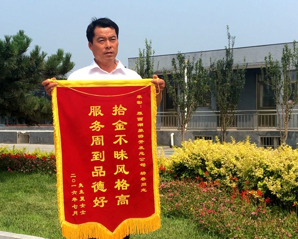 7月5日,雁棲湖公司辦公室收到一件郵件包裹,打開後,發(fā)現(xiàn)是一面錦旗,上面寫著“拾金不昧風格高,服務周到品德好”。經(jīng)過調(diào)查,才知道這面錦旗的由來。