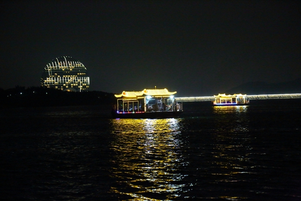 雁棲湖夜晚景觀獨(dú)具魅力,乘坐游船夜晚游覽,別有一番風(fēng)韻。雁棲湖自然山水在七彩燈光的映襯下更加嫵媚動人,雁棲島上APEC會議中心、雁棲塔以及各式精美建筑的燈光效果如夢如幻。夜晚中銀白色的日出東方酒店如同巨大銀盤,與當(dāng)空的皓月形成空中地上兩輪明月交相輝映的獨(dú)特景觀。