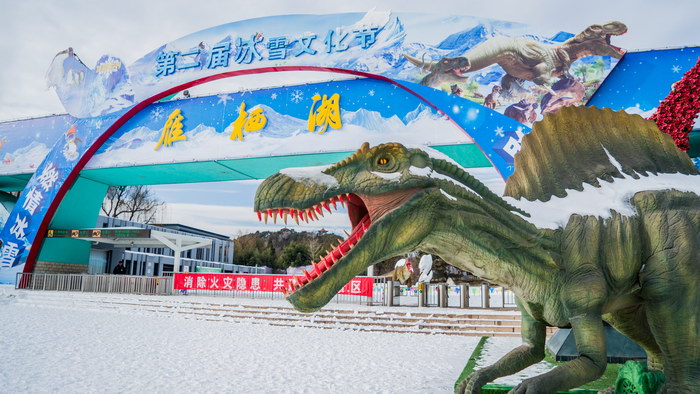 夢(mèng)幻冰雪紀(jì),浪漫恐龍園。12月21日,第二屆北京雁棲湖冰雪文化節(jié)系列活動(dòng)正式啟動(dòng)?;顒?dòng)自2016年12月21日開始,至2017年2月19日結(jié)束,歷時(shí)60天,為廣大游客提供了一個(gè)休閑、娛樂、健身的去處,讓游人忘卻冬季的寒冷,盡享冰雪文化帶來的喜悅和歡樂。其中,重點(diǎn)推出的侏羅紀(jì)恐龍世界主題樂園,通過聲光電科技再現(xiàn)侏羅紀(jì)恐龍群,為孩子的假期增添了新的樂趣。