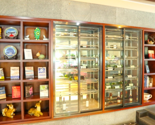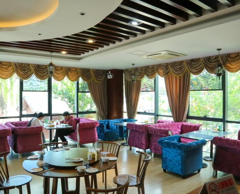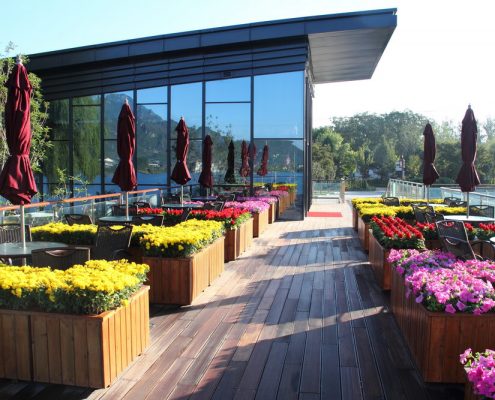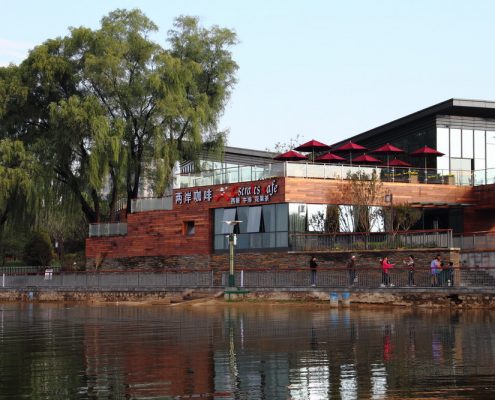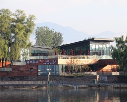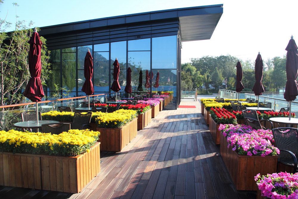 雁棲湖兩岸咖啡廳坐落于雁棲湖景區(qū)北岸,濱水而建,建筑面積1000平方米,分為四個(gè)區(qū)域。整體建設(shè)運(yùn)用現(xiàn)代設(shè)計(jì)理念、采用新穎的建筑形式,通過逐漸縮進(jìn)和疊層手法,與APEC會(huì)址建筑遙相呼應(yīng),渾然一體,形成了濃郁的中國(guó)園林風(fēng)格,核心島內(nèi)建筑盡收眼底。雁棲湖咖啡廳內(nèi)部設(shè)計(jì)頗具匠心,整體采用歐式風(fēng)格,擁有2個(gè)獨(dú)立大廳和1處露臺(tái),是可以同時(shí)接待200多人就餐的中西餐廳。
