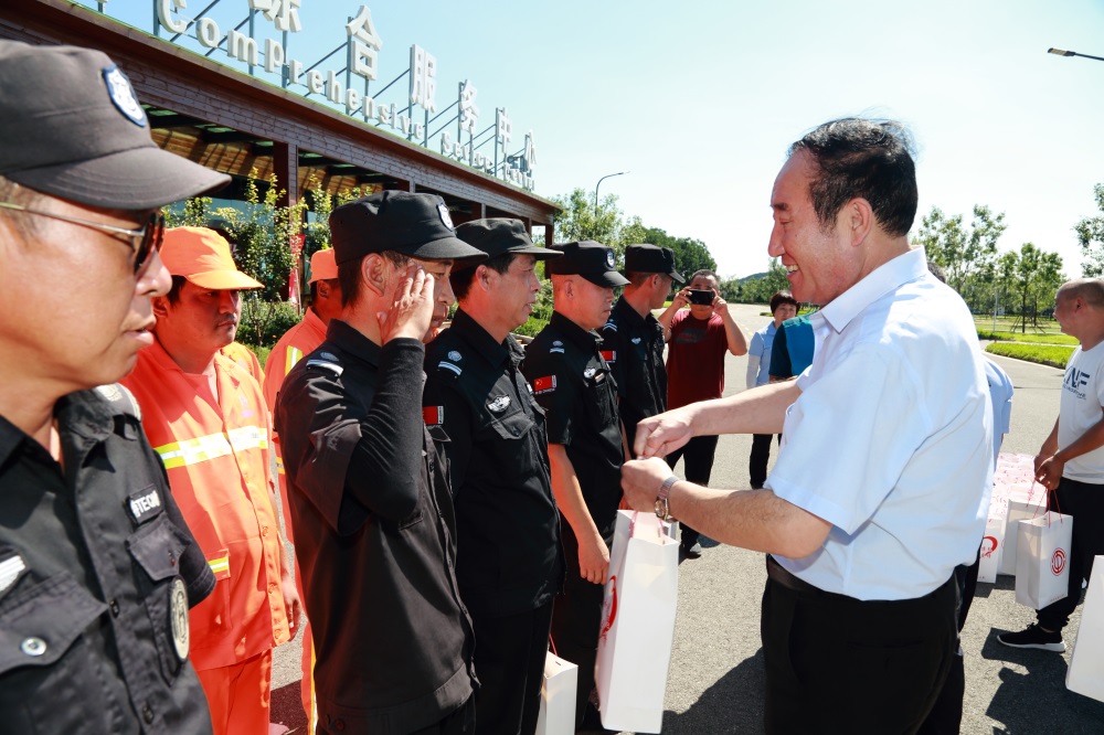 夏日炎炎,熱浪襲人,2018年7月26日,區(qū)總工會(huì)主席曹立倉(cāng)帶隊(duì),來(lái)到北京棲湖物業(yè)公司,將130份包括毛巾、防暑藥品、綠豆及水杯的夏日清涼包,送到堅(jiān)守在一線工作崗位上的環(huán)境保潔人員與保安人員手中,在烈日酷暑中為他們送來(lái)一片溫暖與清涼。區(qū)總工會(huì)副調(diào)研員胡慶森,北京雁棲湖生態(tài)發(fā)展示範(fàn)區(qū)管理委員會(huì)副主任袁振林、董學(xué)軍,以及北京雁棲湖旅遊區(qū)開發(fā)總公司黨總支副書記於榮田參加了慰問(wèn)活動(dòng)。
