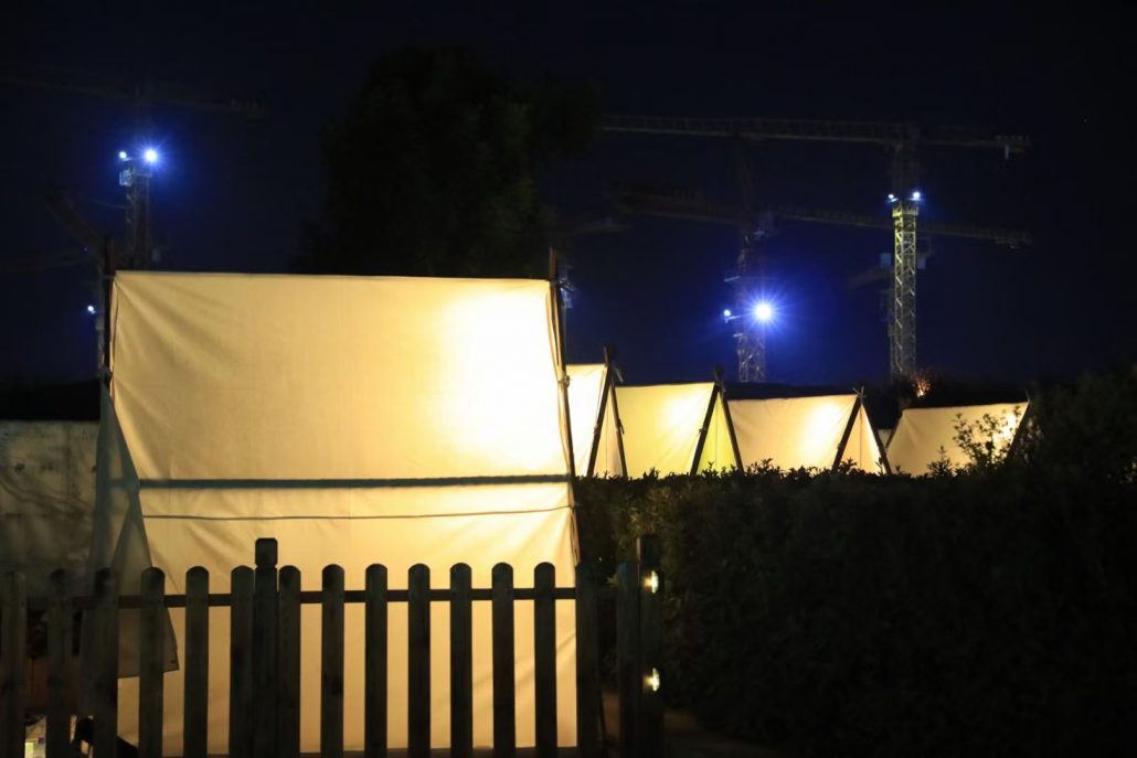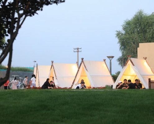 帳篷露營區(qū)打造以影視文化為主題的社交場所,位置選取在文化中心北側(cè)綠地處,面積開闊且四面無高樓建筑,私密性較好,更好展現(xiàn)輕奢的露營風格,吸引周邊年輕人的光顧,提升口碑以及回頭率。