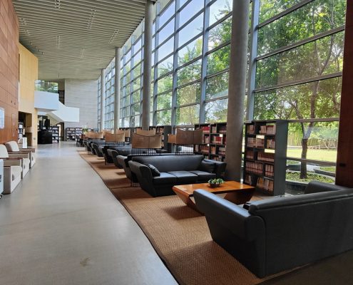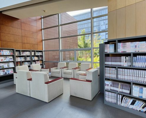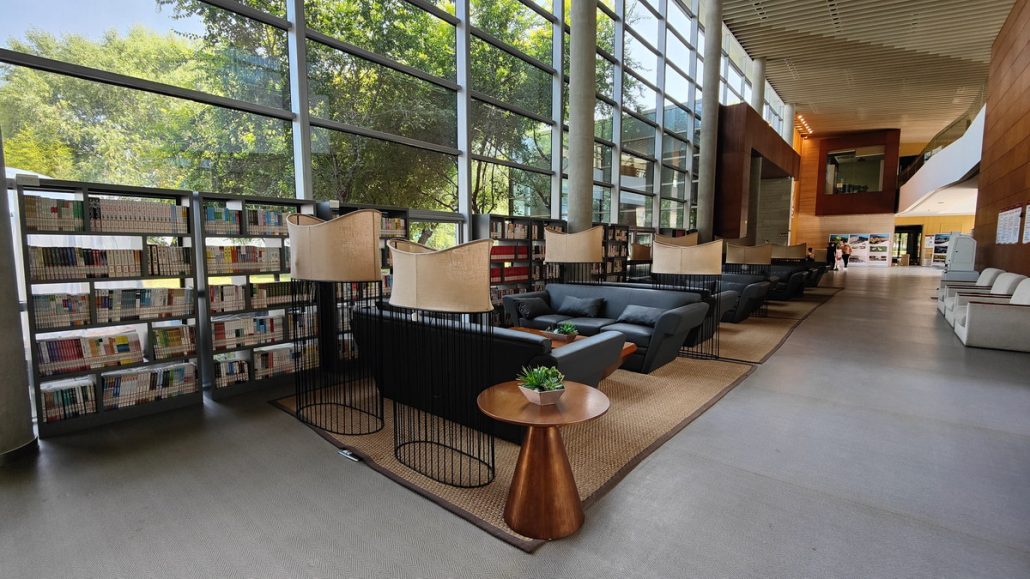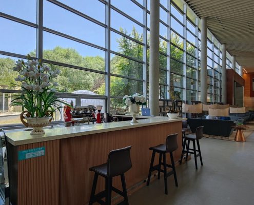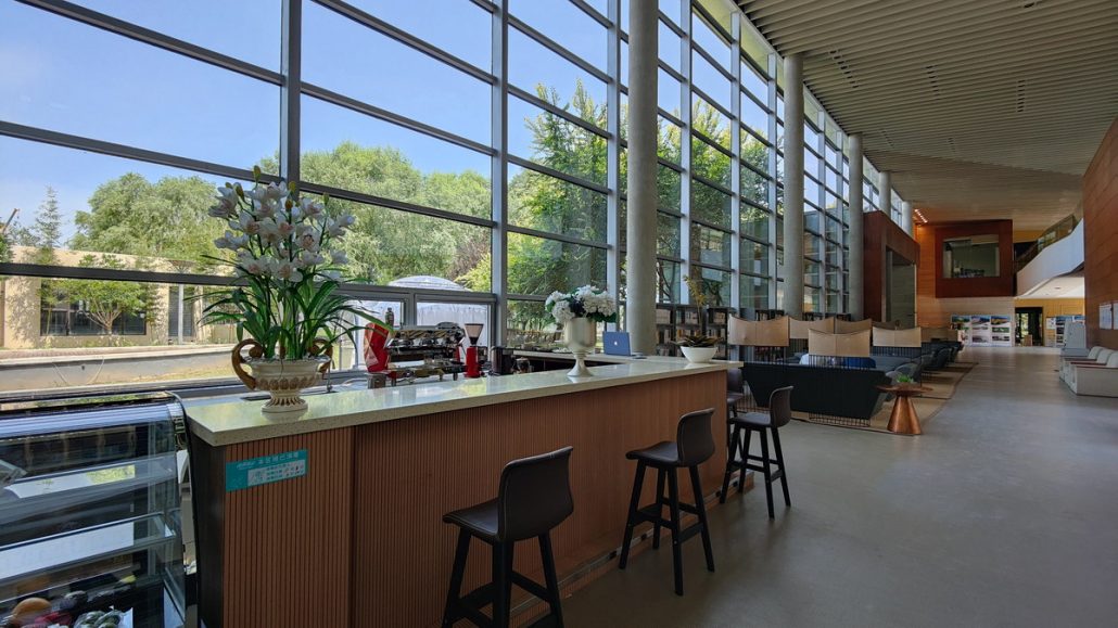 咖啡吧位于文化中心一層,同時作為兼顧室內(nèi)外消費的核心關鍵,服務休閑露營區(qū)的簡餐供給、服務露臺休閑區(qū)的咖啡茶飲、以及來文化中心借閱圖書人的茶歇甜點。