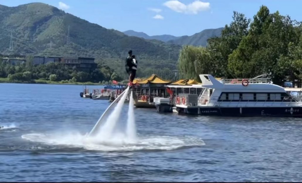 水上飛人是由摩托艇和飛行帶客的兩名工作人員負責控制,依靠附在摩托艇噴水口上的一條巨大水管抽吸雁棲湖水,再通過水上飛行器將水噴出,產(chǎn)生反衝動力,專業(yè)工作人員控制水上飛行器上升高空。遊客身高在1米以上及150斤以下方可參與,跟隨工作人員一起升至空中,飛行器底端噴出層層浪花,充分體驗到在高空旋轉飛行時帶來的刺激。