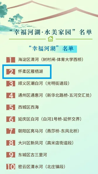 2023年北京市“幸福河湖·水美家園”市級評定名單出爐,經過區(qū)級創(chuàng)建、專家評審、公眾滿意度調查、公示監(jiān)督等環(huán)節(jié)——懷柔雁棲湖入選北京市十處“幸福河湖”名單!