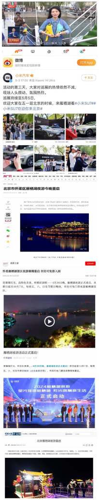 “五一”期間,央廣網(wǎng)、人民網(wǎng)、中國(guó)新聞網(wǎng)、北京時(shí)間、北京日?qǐng)?bào)、中國(guó)日?qǐng)?bào)、小米汽車(chē)官方微博等眾多媒體共同聚焦雁棲湖景區(qū),不同視角報(bào)道服務(wù)保障、文創(chuàng)商品,特色展覽等品牌效應(yīng)持續(xù)放大。