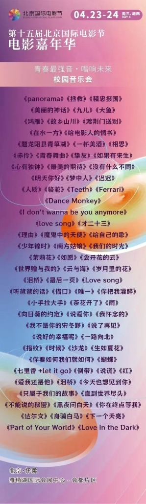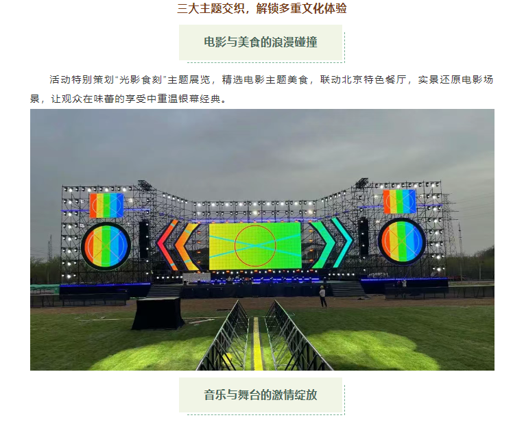 4月18日至26日,第十五屆北京國際電影節(jié)電影嘉年華五大板塊活動之一“電影音樂美食嘉年華”,將在北京雁棲湖國際會展中心東側(cè)大草坪精彩呈現(xiàn)?;顒右浴肮庥啊睘槊}絡(luò)、以“文化”為內(nèi)核、以“體驗(yàn)”為宗旨,融合電影、音樂與美食三大主題,將為市民游客打造多層次文化盛宴,讓大家齊聚懷柔,共度美好時光。