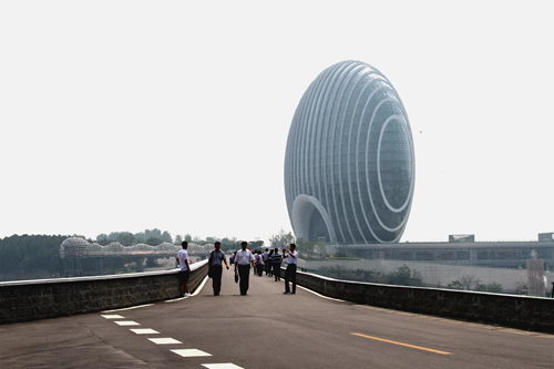 日出東方酒店共21層、高79米,共306套客房。 日出東方照盛景,水天一色耀太平。銀色圓盤造型的設(shè)計(jì)理念傳承著“天人合一”的中華哲學(xué),以圓表達(dá)人與自然平衡相處的理念,體現(xiàn)全球合作、和諧共生的主旨,并通過(guò)獨(dú)特的玻璃幕墻透光設(shè)計(jì)營(yíng)造出“太陽(yáng)從湖面下方升起”的幻境。清晨日出光耀盛景,夜色斑斕明月親水,于日出日落間充分寓意了推動(dòng)全球的和諧與共融,成為懷柔地區(qū)一個(gè)特色鮮明的地標(biāo)性當(dāng)代建筑。